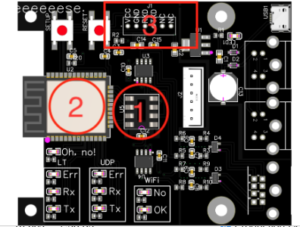 1) The TashTalk microcontroller will be placed in this socket. It handles all the aspects of LocalTalk. 2) The heart of the AirTalk; the main microcontroller with integrated Wi-FI. 3) The programmer-connector