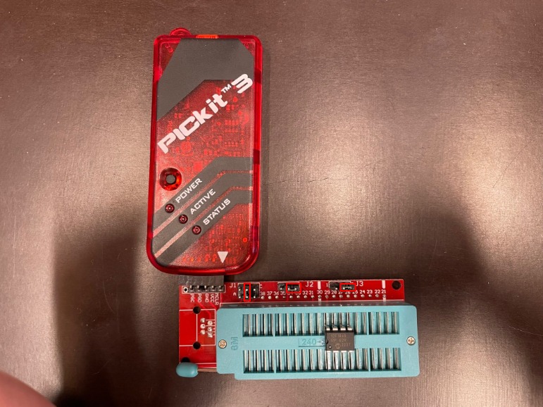 Connect the seatboard directly to the PICKIT device and seat the PIC-chip on the right location on the seat board” (see backside of the seat board). This should look like this: